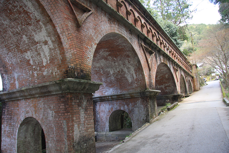 水路閣は、疎水事業の一環として施工されたもので、延長約93m、幅約4m、水路幅約2.5mの煉瓦造の水路橋です。アーチ構造の優れたデザインで、よくドラマの撮影などにも使用されています。水路閣は南禅寺の境内を横切っているため、南禅寺を訪れたついでに記念撮影して帰る人が多い場所です。毎秒2トンの水が流れているそうです。