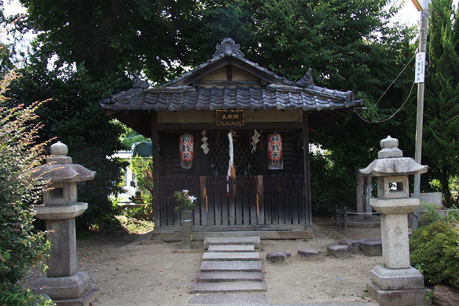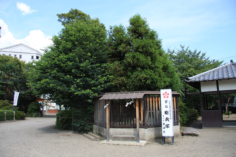 境内には道真公のへその緒を埋めたと伝えられている「胞衣(えな)塚」や、少年時代に習字に使用したという「硯の水」、参朝時に顔を写したと伝える「鑑の井」などがあります。