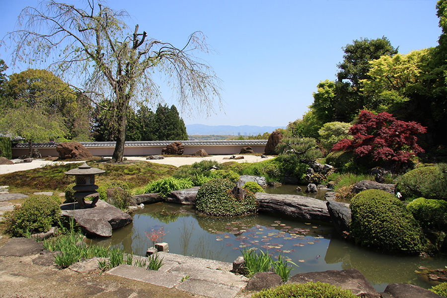 庭園には樹齢80年の見事な紅枝垂桜があり、全国各地から収集し、動物の形に見立てた石が配されています。水琴窟もあります。
